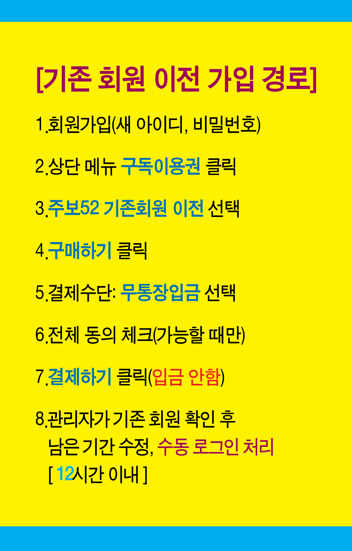 주보52의 기존 회원(이용 기간이 남아있는) 분들께서는 여기서 구독을 진행해 주시기 바랍니다. 주보52 관리자가 회원 정보 확인 후 남아있는 사용기간과 함께 이용일을 수정해 드릴 예정입니다. (무통장 입금으로 선택 후 구매를 진행해 주시기 바랍니다★실제 입금은 하지 않습니다)